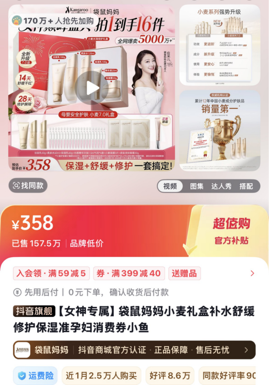 在袋鼠妈妈官方旗舰店的直播间里,主播一遍遍向观众推荐着品牌主打的小麦礼盒,强调它补水、舒缓、修护、保湿,反复强调 “准孕妇可用”。