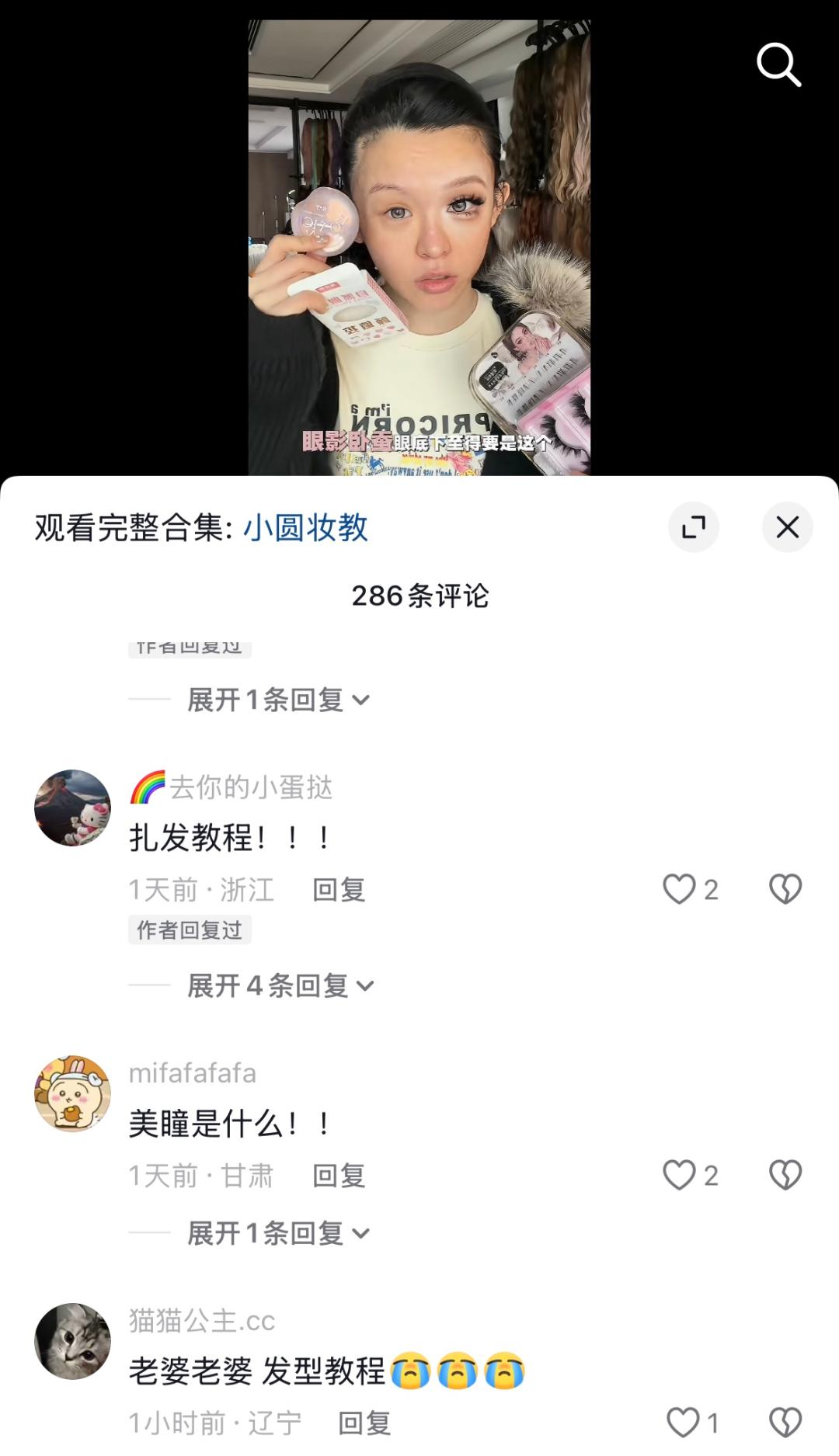 以因假发内容出圈的美妆博主@小圆圆不圆为例,其妆教视频的评论区里,不少人都在追问假发怎么打理、求假发链接;而在她假发推荐视频下,又有大批网友催更妆教。