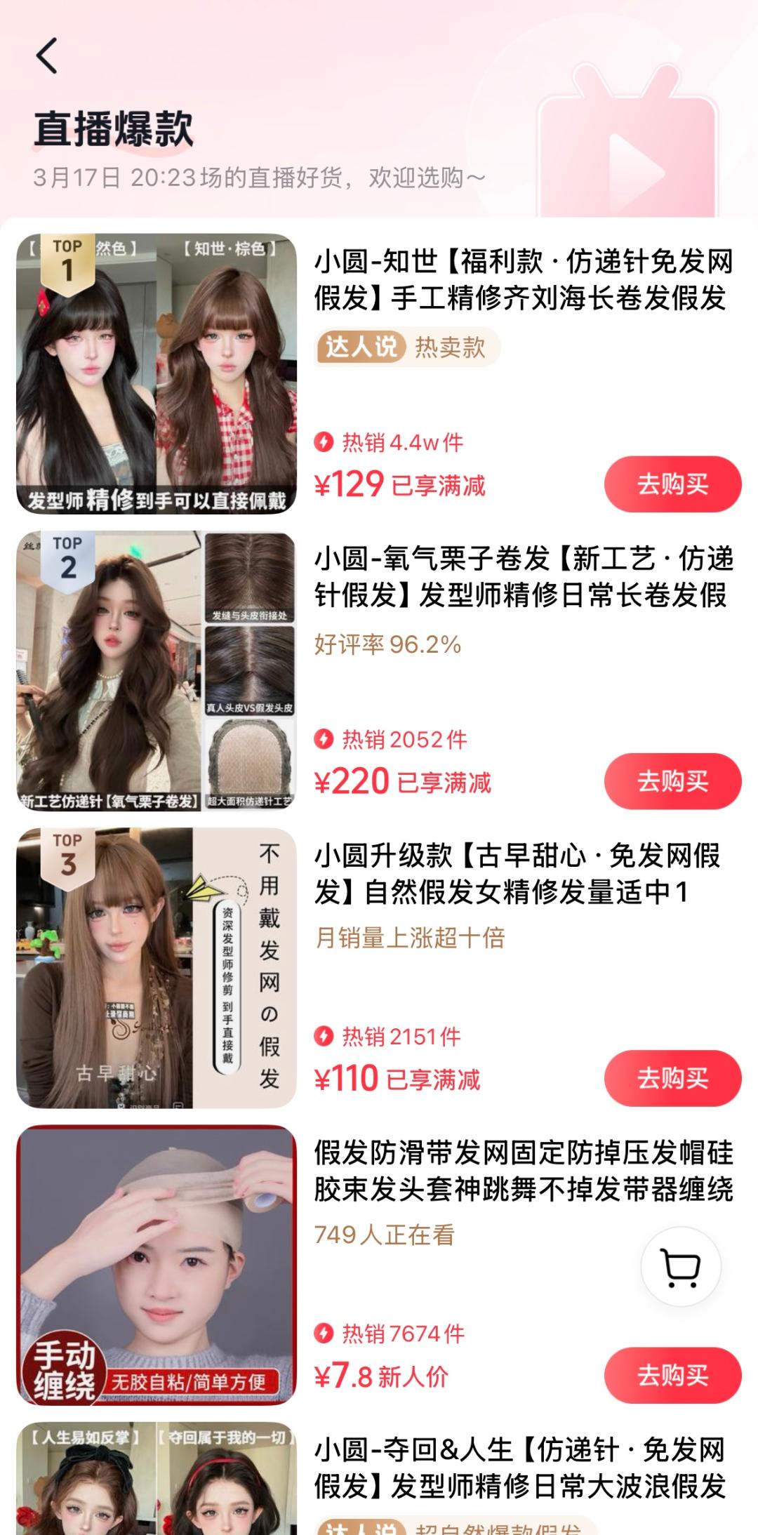 以@小圆圆不圆为例,其抖音直播爆款中销量最高的一款假发销量已破4.4万件。