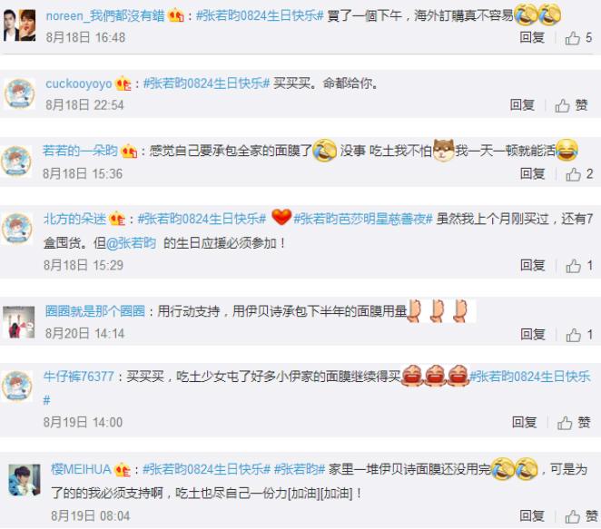 应援活动一经发出,便得到了全球迷妹“昀朵”们的积极响应和支持。“买买买命都给你”、“吃土也要买买买”、“用伊贝诗承包下半年的面膜用量”,更有海外粉丝疯狂剁手,狂买一个下午。