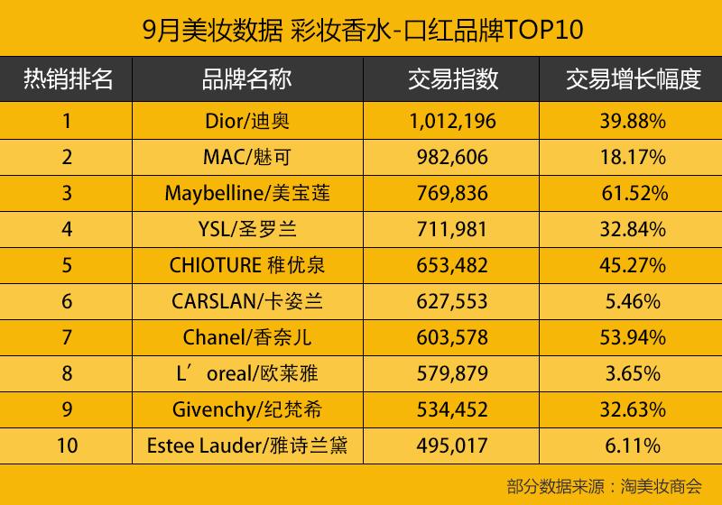 9月美妆数据彩妆香水-口红品牌TOP10为:Dior/迪奥、MAC/魅可、Maybelline/美宝莲、YSL/圣罗兰、CHIOTURE稚优泉、CARSLAN/卡姿兰、Chanel/香奈儿、L'oreal/欧莱雅、Givenchy/纪梵希、Estee Lauder/雅诗兰黛。