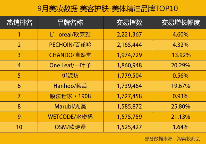 9月美妆数据美容护肤-美体精油品牌TOP10为:L'oreal/欧莱雅、PECHOIN/百雀羚、CHANDO/自然堂、One Leaf/一叶子、御泥坊、Hanhoo/韩后、膜法世家·1908、Marubi/丸美、WETCODE/水密码、OSM/欧诗漫。