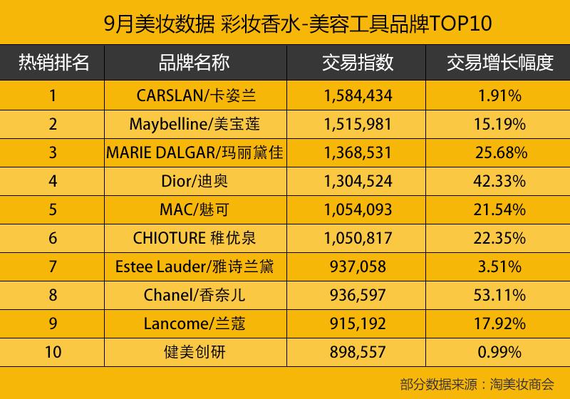 9月美妆数据彩妆香水-美容工具品牌TOP10为:CARSLAN/卡姿兰、Maybelline/美宝莲、MARIE DALGAR/玛丽黛佳、Dior/迪奥、MAC/魅可、CHIOTURE稚优泉、Estee Lauder/雅诗兰黛、Chanel/香奈儿、Lancome/兰蔻、健美创研。