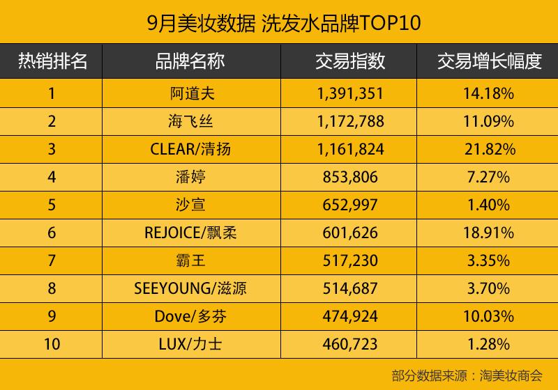 9月美妆数据洗发水品牌TOP10为:阿道夫、海飞丝、CLEAR/清扬、潘婷、沙宣、REJOICE/飘柔、霸王、SEEYOUNG/滋源、Dove/多芬、LUX/力士。