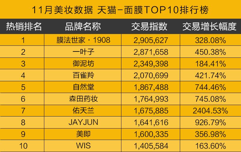 11月天猫面膜TOP10排行榜:膜法世家·1908、一叶子、御泥坊、百雀羚、自然堂、森田药妆、佑天兰、JAYJUN、美即、WIS。