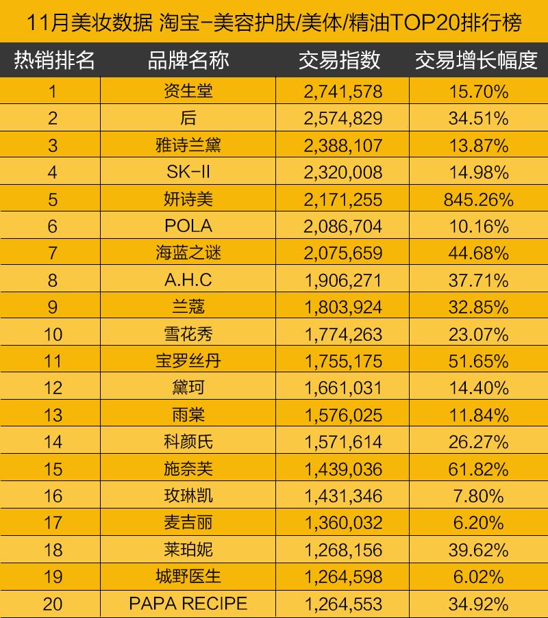 11月淘宝美容护肤/美体/精油TOP20排行榜:资生堂、后、雅诗兰黛、SK-II、妍诗美、POLA、海蓝之谜、A.H.C、兰蔻、雪花秀、宝罗丝丹、黛珂、雨棠、科颜氏、施耐芙、玫琳凯、麦吉利、莱珀妮、城野医生、paparecipe。