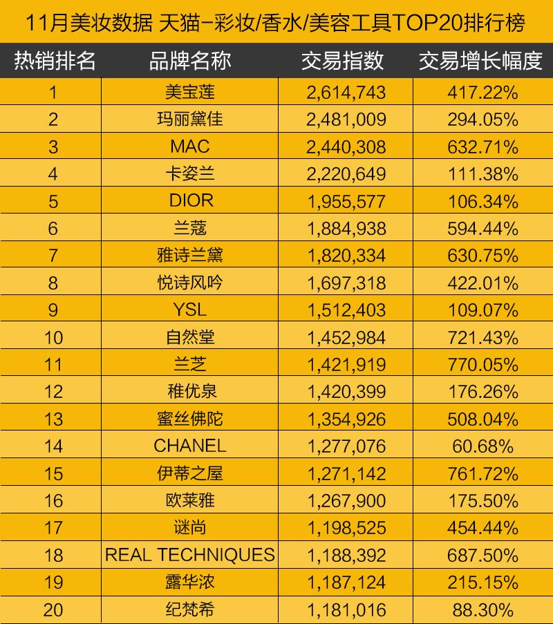 11月天猫彩妆/香水/美容工具TOP20排行榜:美宝莲、玛丽黛佳、MAC、卡姿兰、Dior、兰蔻、雅诗兰黛、悦诗风吟、YSL、自然堂、兰芝、稚优泉、蜜丝佛陀、CHANEL、伊蒂之屋、欧莱雅、谜尚、real techniques、露华浓、纪梵希。