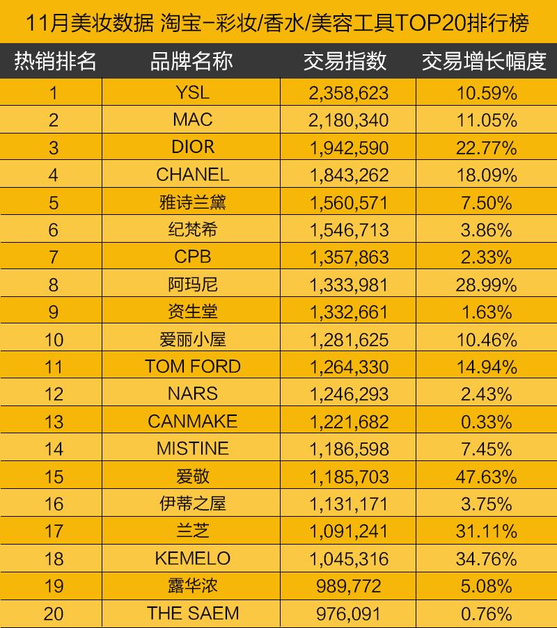 11月淘宝彩妆/香水/美容工具TOP20排行榜:YSL、MAC、DIOR、CHANEL、雅诗兰黛、纪梵希、CPB、阿玛尼、资生堂、爱丽小屋、TOM FORD、NARS、CANMAKE、MISTINE、爱敬、伊蒂之屋、兰芝、KEMELO、露华浓、THE SAEM。