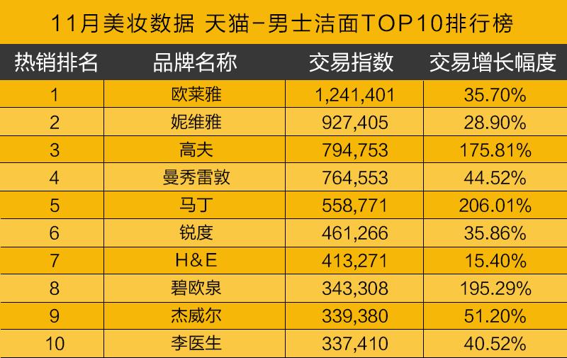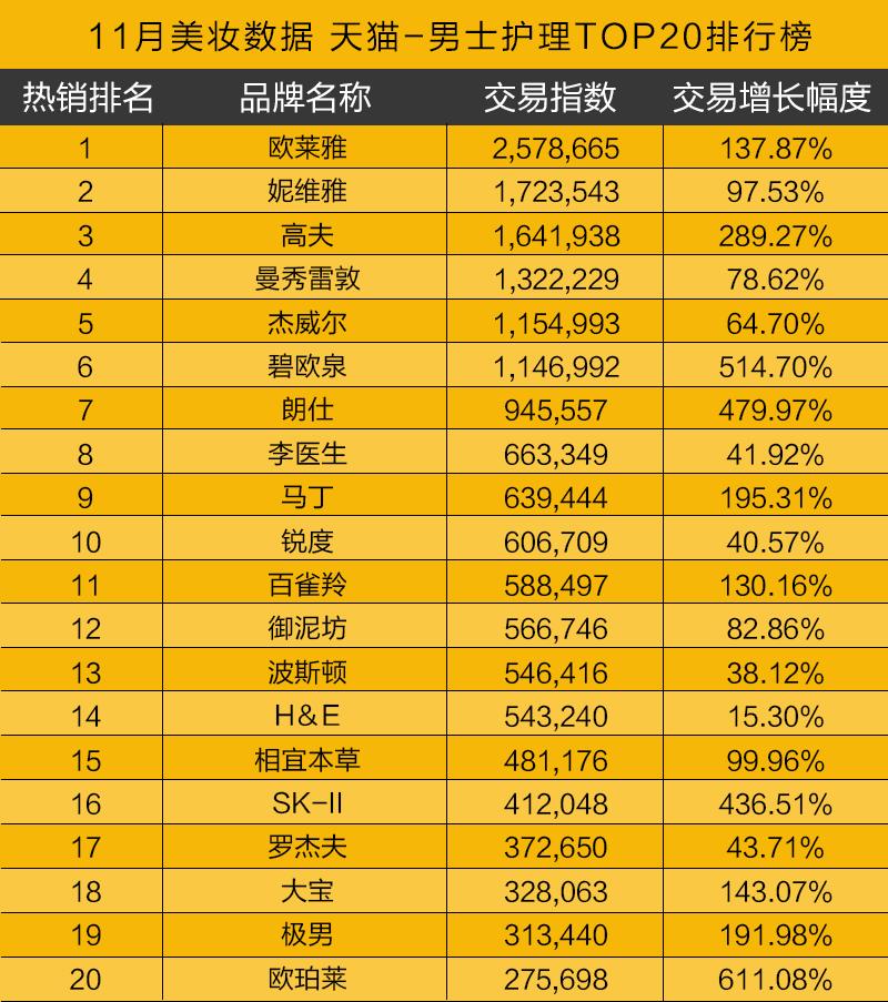 11月天猫男士护理TOP20排行榜:欧莱雅、妮维雅、高夫、曼秀雷敦、杰威尔、碧欧泉、朗仕、李医生、马丁、锐度、百雀羚、御泥坊、波斯顿、H&E、相宜本草、SK-II、罗杰夫、大宝、极男、欧珀莱。