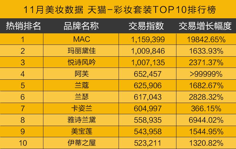 11月天猫彩妆套装TOP10排行榜:MAC、玛丽黛佳、悦诗风吟、阿芙、兰蔻、兰瑟、卡姿兰、雅诗兰黛、美宝莲、伊蒂之屋。