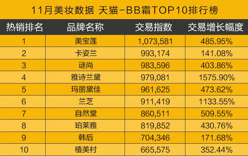 11月天猫BB霜TOP10排行榜:美宝莲、卡姿兰、谜尚、雅诗兰黛、兰芝、自然堂、珀莱雅、韩后、植美村。