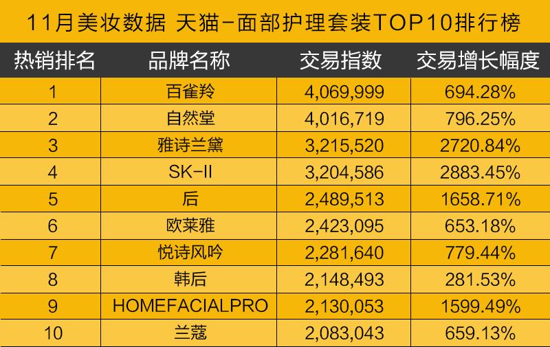 11月天猫面部护理套装TOP10排行榜:百雀羚、自然堂、雅诗兰黛、SK-II、后、欧莱雅、悦诗风吟、韩后、HomeFacialPro、兰蔻。