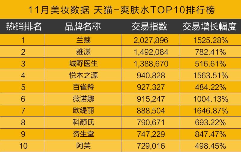 11月天猫爽肤水TOP10排行榜:兰蔻、雅漾、城野医生、悦木之源、百雀羚、薇诺娜、欧缇丽、科颜氏、资生堂、阿芙。