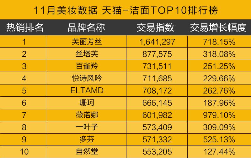 11月天猫洁面TOP10排行榜:芙丽芳丝、丝塔芙、百雀羚、悦诗风吟、ELTAMD、珊珂、薇诺娜、一叶子、多芬、自然堂。