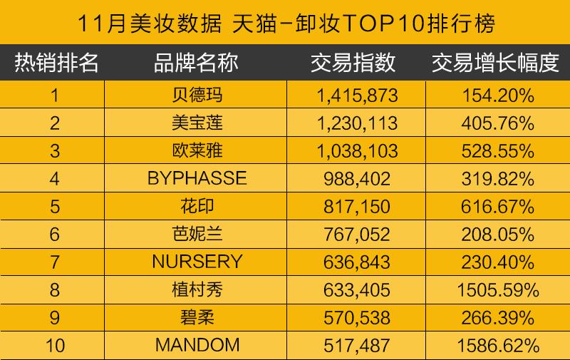 11月天猫卸妆TOP10排行榜:贝德玛、美宝莲、欧莱雅、byphasse、花印、芭妮兰、nursery、植村秀、碧柔、mandom。