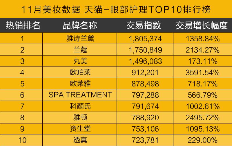 11月天猫眼部护理TOP10排行榜:雅诗兰黛、兰蔻、丸美、欧珀莱、欧莱雅、Spa treatment、科颜氏、雅顿、资生堂、透真。