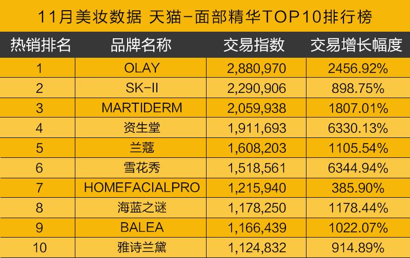 11月天猫面部精华理TOP10排行榜:OLAY、SK-II、MartiDerm、资生堂、兰蔻、雪花秀、HomeFacialPro、海蓝之谜、Balea、雅诗兰黛。