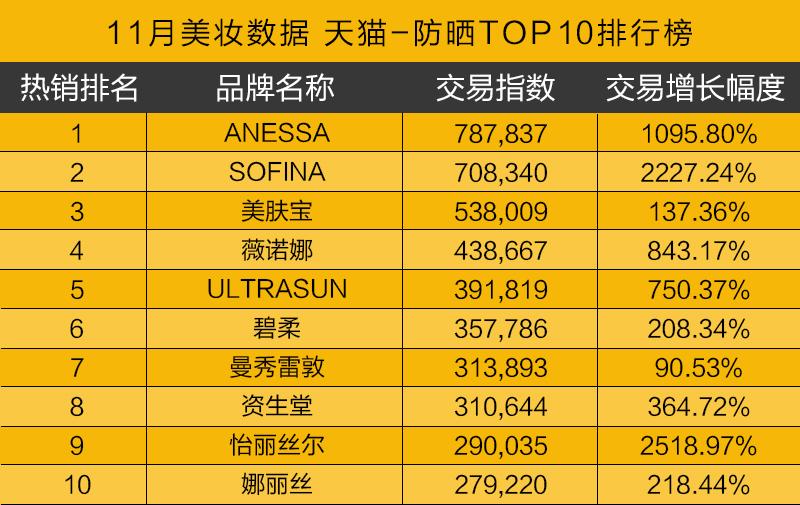 11月天猫防晒TOP10排行榜:Anessa、Sofina、美肤宝、Ultrasun、碧柔、曼秀雷敦、资生堂、怡丽丝尔、娜丽丝。