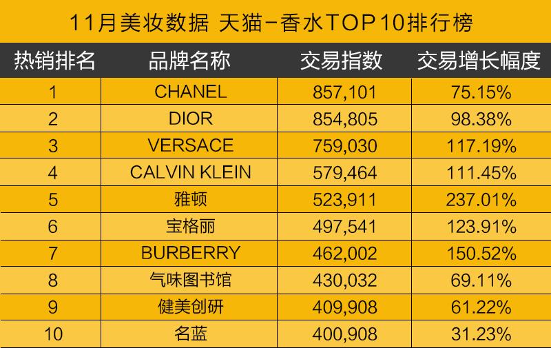 11月天猫香水TOP10排行榜:CHANEL、Dior、Versace、CK、雅顿、宝格丽、Burberry、气味图书馆、健美创研、名蓝。