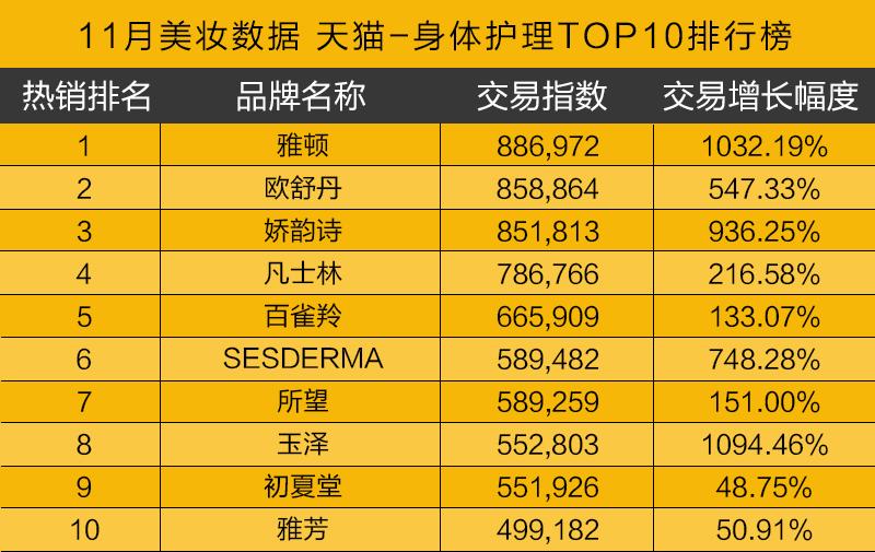 11月天猫身体护理TOP10排行榜:雅顿、欧舒丹、娇韵诗、凡士林、百雀羚、SESDERMA、所望、玉泽、初夏堂、雅芳。