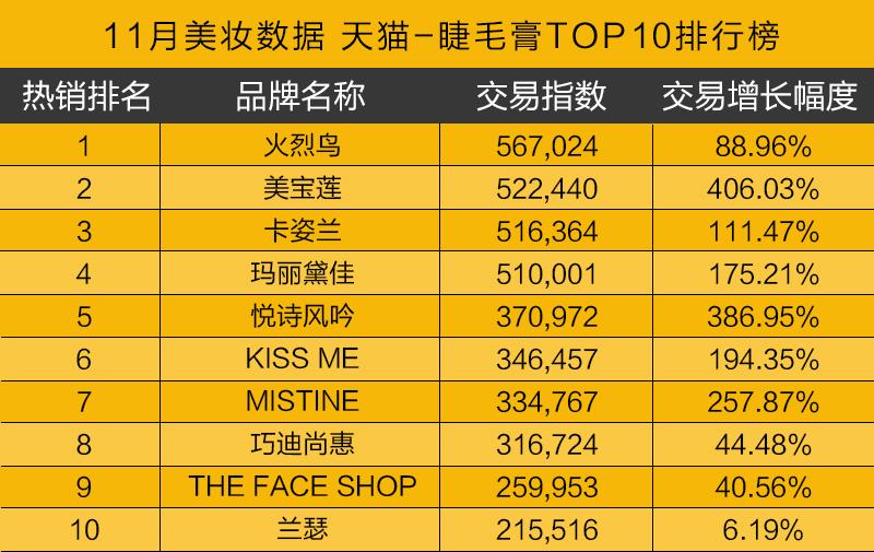 11月天猫睫毛膏TOP10排行榜:火烈鸟、美宝莲、卡姿兰、玛丽黛佳、悦诗风吟、KISS ME、MISTINE、巧迪尚惠、The Face Shop、兰瑟。