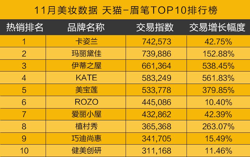 11月天猫眉笔TOP10排行榜:卡姿兰、玛丽黛佳、伊蒂之屋、KATE、美宝莲、ROZO、爱丽小屋、植村秀、巧迪尚惠、健美创研。