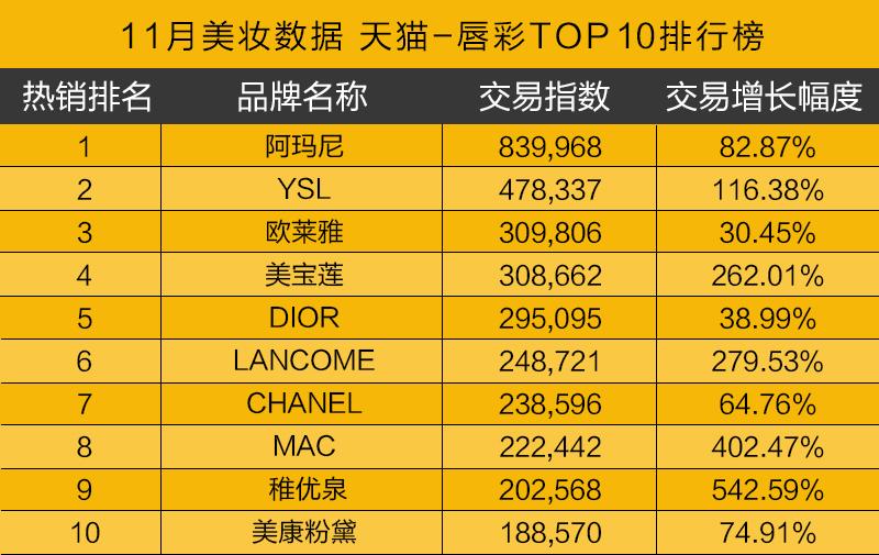 11月天猫唇彩TOP10排行榜:阿玛尼、YSL、欧莱雅、美宝莲、DIOR、兰蔻、CHANEL、MAC、稚优泉、美康粉黛。