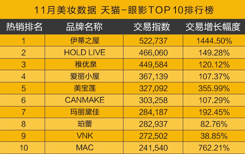 11月天猫眼影TOP10排行榜:伊蒂之屋、HOLD LIVE、稚优泉、爱丽小屋、美宝莲、CANMAKE、玛丽黛佳、VNK、MAC。