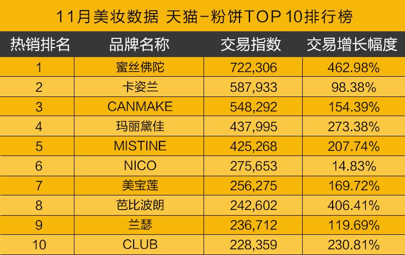 11月天猫粉饼TOP10排行榜:蜜丝佛陀、卡姿兰、CANMAKE、玛丽黛佳、MISTINE、NICO、美宝莲、芭比波朗、兰瑟、CLUB。
