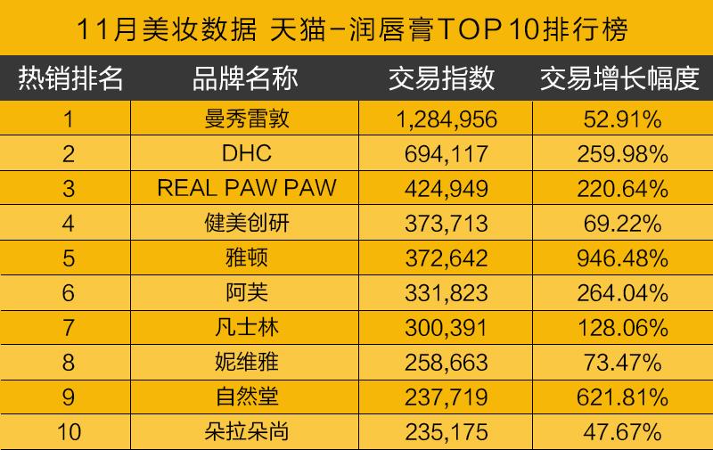 11月天猫润唇膏TOP10排行榜:曼秀雷敦、DHC、Real Paw Paw、健美创研、雅顿、阿芙、凡士林、妮维雅、自然堂、朵拉朵尚。