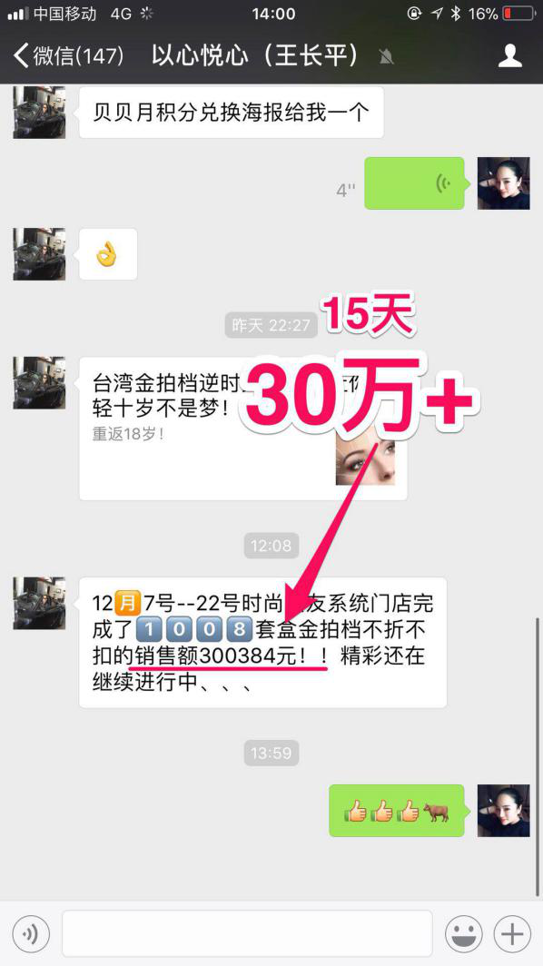百强系统时尚女友连锁店的总经理王长平更是首站打板,二话不说,直接开干。据了解,当前旗下的六家门店六天不折不扣的实销了20多万,创下了辉煌的业绩,引得同业老板惊叹不已。王长平表示,金拍档提出的“医学美容护理专区”确实是迎合了我们化妆品门店的需求,自从金拍档上架以来,0退货,0投诉,体验购买率达80%以上,客户的返单率也极高,口口相传更是做出了招牌特色,这是十分喜人的,我们正在全力以赴打造全系统的3平方医学美容护理专区,相信这将打开我们之前所流失掉的一个巨大的快捷美容保养市场。同时金拍档的买产品赠服务也很贴近时下女性,医美级的产品品质,配合水光针、超声刀等光电仪器能快速改善问题性皮肤,帮助皮肤重新焕发新生,其“午餐式美容”更是吸引了大量客户提前预约。客户的粘性增加了,我们进店消费的顾客也多了起来,能实现双赢的局面,我们何乐而不为呢!