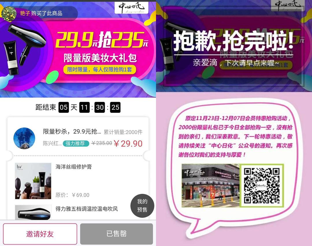 作为有礼派智能美妆门店服务平台在湖南省的合作伙伴,聚之美已协助有礼派在湖南省开拓了900余家合作门店,而浏阳中心日化则是其中较有代表性的门店之一。2017年11月23日-12月7日,浏阳中心日化开始了第一次线上预售活动。