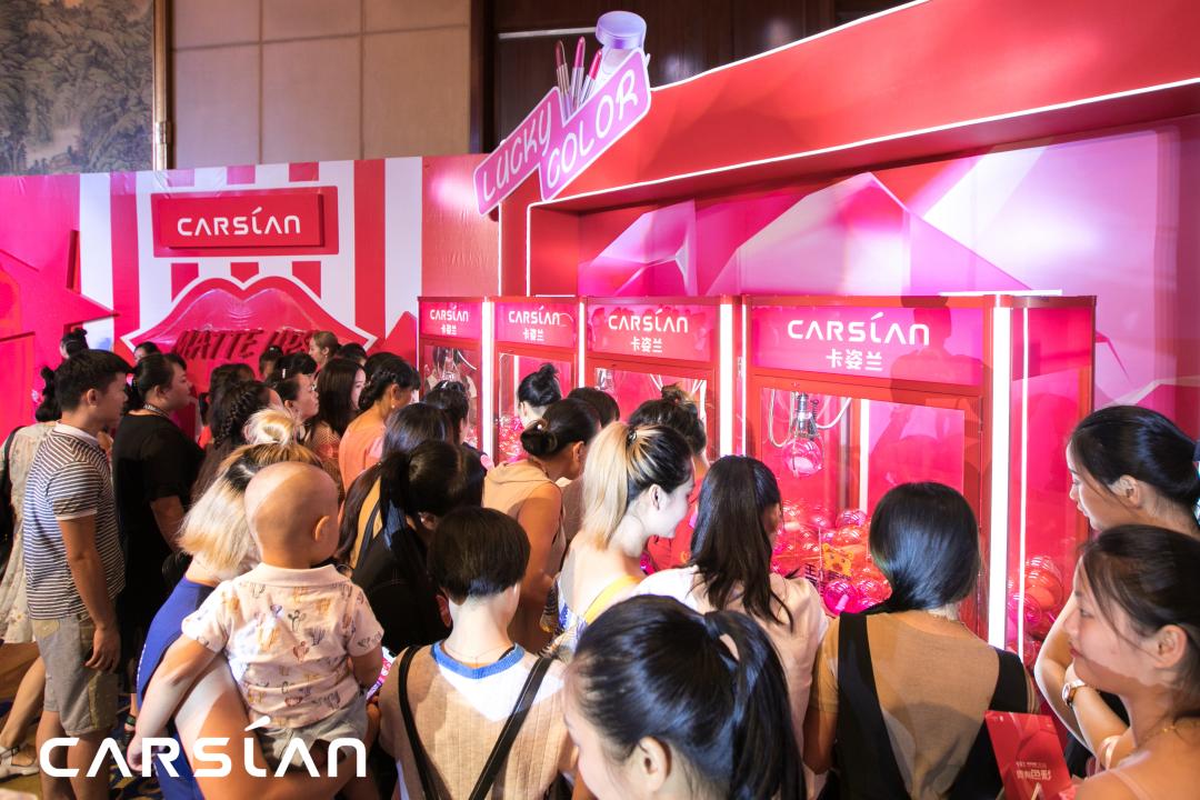 在现场,鲜锋君看到场内设置了5个互动环节,包括幸运娃娃机、360度环绕拍照、新品抢鲜区、DJ台和封面大片拍摄区,其中的四台娃娃机,消费者领取入场券后,就可获得两枚硬币和两次夹娃娃的机会,而娃娃机内的产品正是卡姿兰热销的爆品,该区域一度排起了长队。