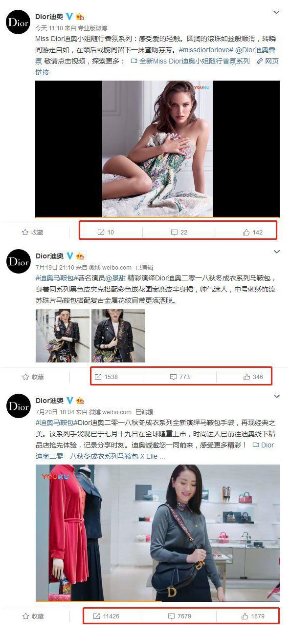 ▲ Dior官微发布“某李小姐喜提马鞍包“视频与日常内容关注度对比