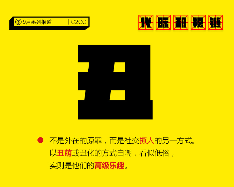 在年轻人的词汇里,“丑”已不是外在的原罪,它变成了撩人的另外一种方式,比如和“萌”组合在一起,以一种“丑萌”或丑化的方式进行自嘲,同时用来“嘲笑”他人,这一种甩开偶像包袱的低级审美,反而成为了他们的高级乐趣。