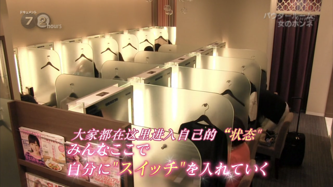 大型商场的女性卫生间统称为化妆间,化妆间内配备桌椅和独立的化妆镜,日本NHK节目《纪实72小时 化妆间里的女人们》就曾清晰展示过公共化妆间,通常设立在大巴车站旁,以便于夜间出行的女性使用,有蒸脸仪、吹风机、烫发棒等基本美容工具,甚至还出租款式多样的化妆产品。