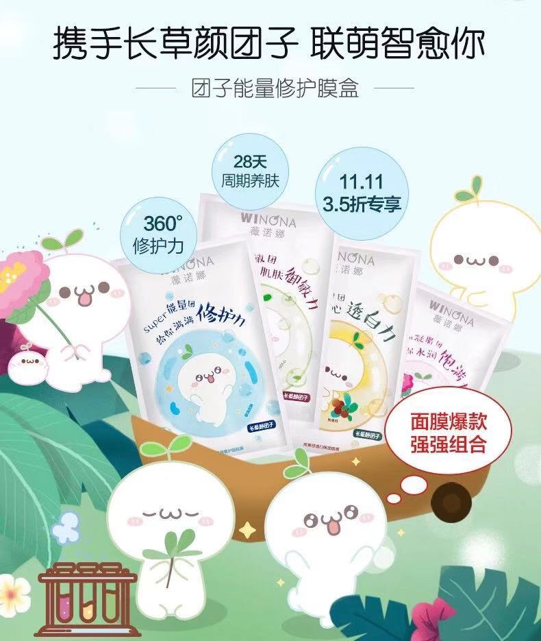 10月底,薇诺娜推出首款IP定制面膜,将其四款不同功效的爆款面膜与在微信、QQ下载量上亿次的IP网红表情包长草颜团子跨界合作,推出“团子能量修复膜盒”联名款,在天猫旗舰店双11首发,并提前预售。截至11月10日,该联名款已预订2.2万盒。将软萌暖心的IP形象和具有抗敏修护呵护的产品形象有效结合,薇诺娜此举在年轻人心中植入了“团子面膜”、“能量修护”有趣的印象。