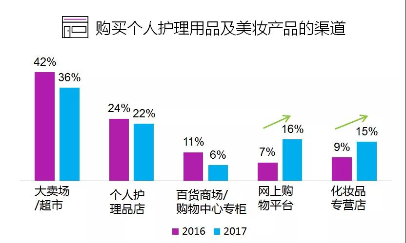 伴随着消费升级,人们对美的追求也在不断提升。根据尼尔森最新发布的《中国大陆个人护理品和化妆品专营店购物者趋势研究》报告显示,过去12个月,个人护理品店购物者的渗透率为43%,美妆店购物者渗透率为29%,同时去两种渠道的购物者渗透率为17%。大卖场/超市(36%)依然是购买个护及美妆产品渗透率最高的渠道,而网上购物平台(16%)和化妆品专营店(15%)的增长势头强劲。