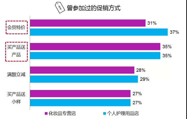 尼尔森研究发现个护店或美妆店的顾客最常接触的促销方式依次是“会员特价”和“买产品送产品”及“满额立减”。其中一线城市特别是个护店消费者更喜欢“会员特价”;二线城市的美妆店购物者更偏爱“买产品送产品”;而三线城市的购物者对“满额立减”的接受程度更高。