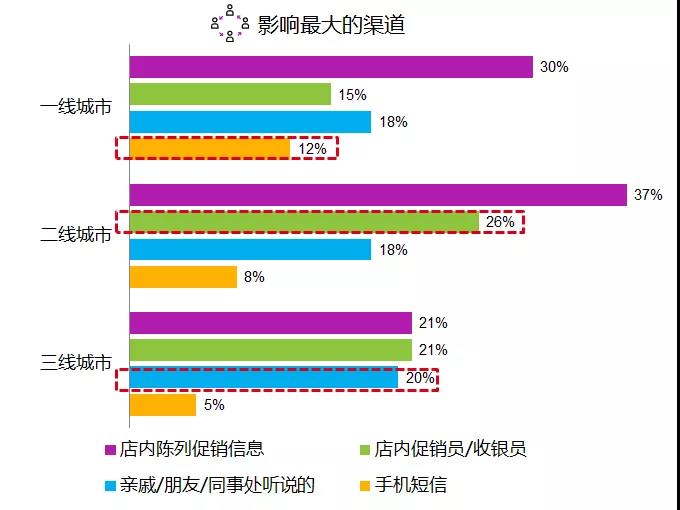 从产品信息渠道来看,一线城市顾客受手机短信影响更大。二线城市顾客信息获取渠道更为丰富,且受店内促销和店员的影响最大。三线城市中,由于信息渠道比较有限, 亲戚/朋友/同事推荐的影响更大。