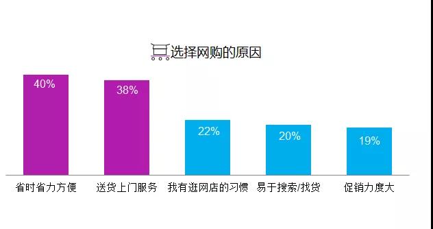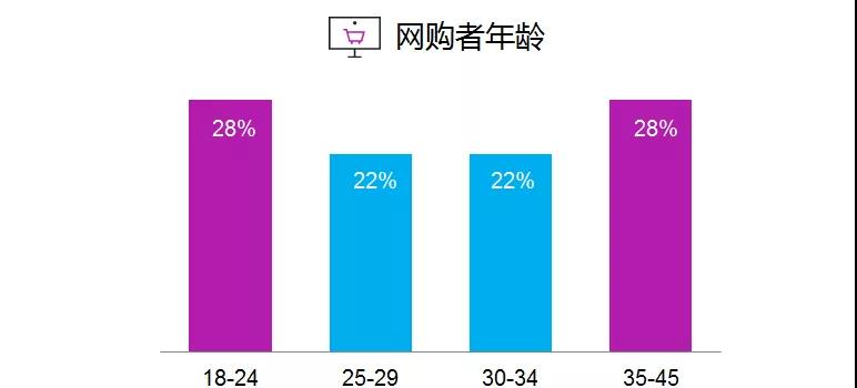 尼尔森数据显示,过去12个月,网购购物者的渗透率为35%。其中,18-24岁和35-45岁的购物者是网购的主力人群。相对而言,网购顾客更年轻,教育程度也更高。“省时省力”(40%)、“送货上门”(38%)这两方面是选择网购的主要原因。这些受访者网购的平均频次为每月2次以上,平均单次花费在250元左右,较去年略有上升。