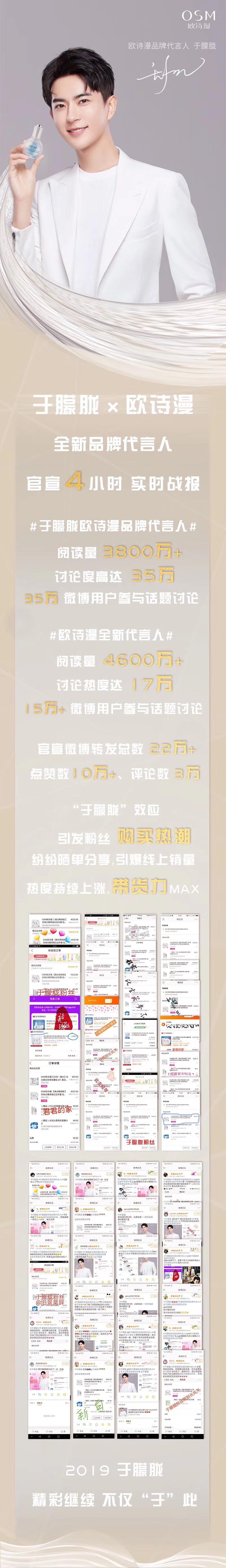 据悉,在欧诗漫官宣于朦胧成为全新品牌代言人后仅4个小时,就在微博上引发了一大波热潮。微博话题#于朦胧欧诗漫品牌代言人#讨论度高达35万,阅读量超过3800万,并有35万微博用户参与话题讨论;微博话题#欧诗漫全新代言人#阅读量超4600万,讨论热度达17万,超过15万的微博用户参与了该话题的讨论。此外,官宣微博也以22万+的转发总数、10万+的讨论数、3万的评论数将“于朦胧”效应更大化,引发粉丝的购买热潮,并进行晒单分享。在带动欧诗漫品牌热度持续上升的同时,也引爆了线上销量,于朦胧的带货力可见一斑。