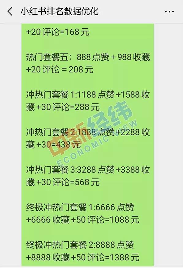 至于笔记刷量的价格,小秋同样提供了一份详细的价格清单。在这份清单中,刷量可以单独刷,也可以购买套餐。中新经纬注意到,如果是单刷的话,增加100个点赞、100个收藏、100个粉丝各需要10元,手工评论则是1元一条。此外,这份清单还提供了10种套餐供选择,比如“套餐一:150点赞+150收藏+10评论=40元”,再比如“终极冲热门套餐2:8888点赞+8888收藏+50评论=1388元”。