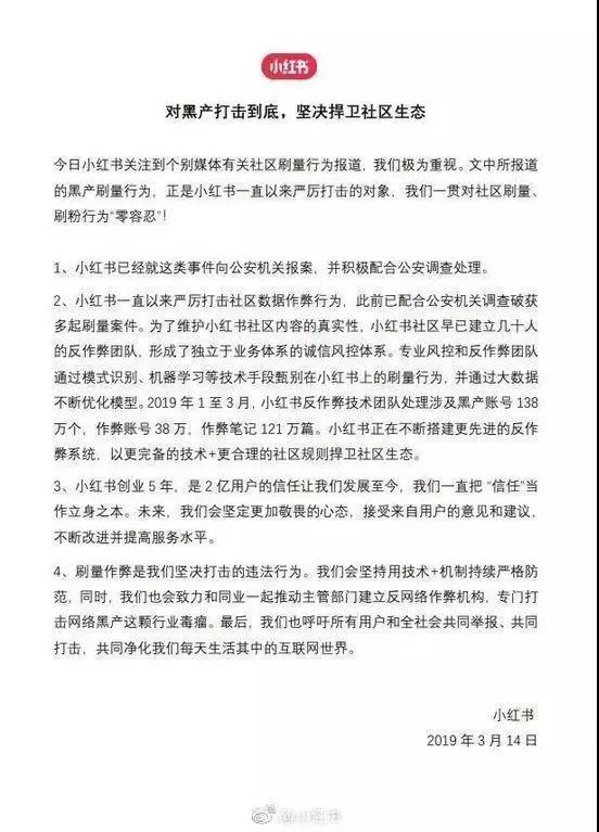 目前,小红书APP官方微博发布声明称,媒体所报道的黑产刷量行为正是小红书一直以来严厉打击的对象,并表示已就这类事件向公安机关报案,而此前也已配合公安机关调查破获多起刷量案件。