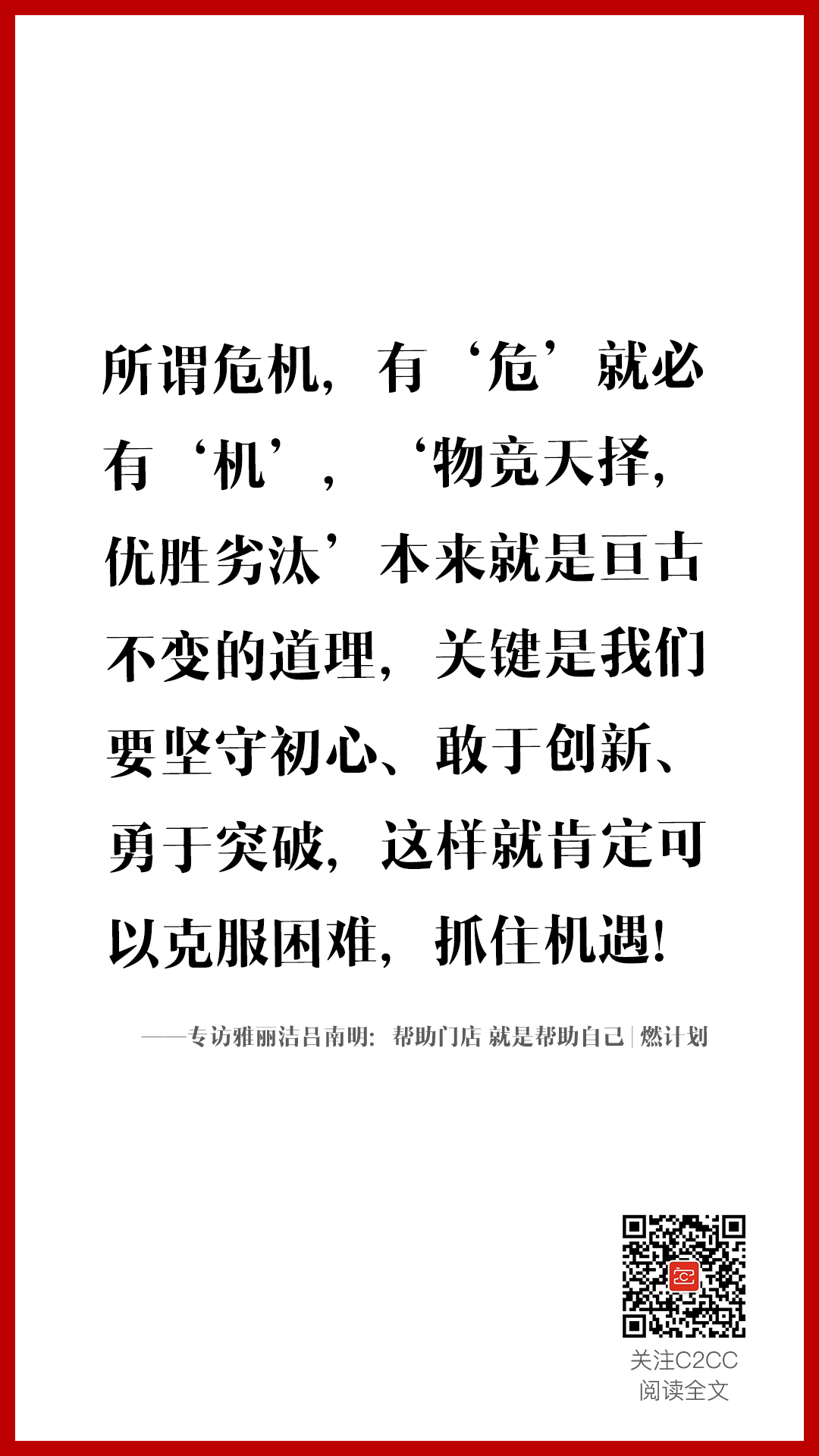 “我对雅丽洁、CS渠道的未来充满信心。所谓危机,有‘危’就必有‘机’,‘物竞天择,优胜劣汰’本来就是亘古不变的道理,关键是我们要坚守初心、敢于创新、勇于突破,这样就肯定可以克服困难,抓住机遇!”吕南明说。