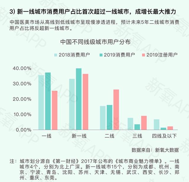《白皮书》数据显示,2019年,医美领域互联网拉平区域发展不平衡的效应出现,中国新一线城市消费用户占比首次超过一线城市,成为市场增长的最大推力。不仅如此,90后一代也更倾向于医学抗衰,医疗美容正在从小众的整形市场“出圈”,走进大众消费群体的视野和生活中。
