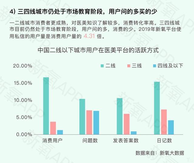 而再往下沉区域看,三四线城市仍处于医美市场教育阶段。数据显示,这一部分用户“问得多,买的少”。在消费用户、问题数、发表答案数、日记数四个指标上,二线城市均遥遥领先。