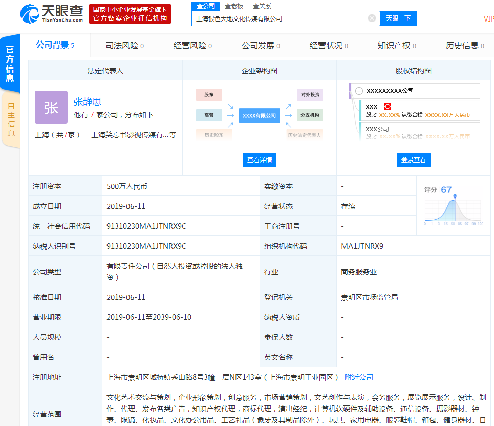 C2CC传媒记者在天眼查搜索后发现,银色大地即“上海银色大地文化传媒有限公司”成立于2019年6月11日,其法人和执行董事是张静思。
