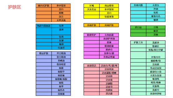 以护肤区为例,商品的模块可细分为顾问式护肤、熟龄问题肌肤、精品护肤、大众名品、高端护肤、精准特护、面部清洁、青春问题、进口品、护肤工具十个类目。