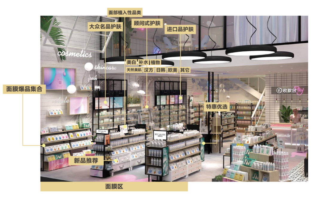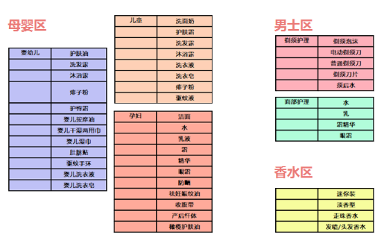 相比于其他品类,彩妆的商品模块做的更加细分,针对彩妆群体匹配的自选式彩妆商品模块(低价位),顾问式彩妆品牌组合模块(中价位)与彩妆名品商品模块(高价位),还在彩妆吧内设立彩妆魔镜及专业工具模块。